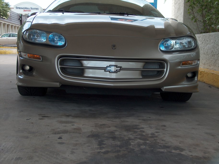 Now the changes start, and here you can see the new grille color coded and Brent's Overlay in black that is for the LT1 but fits here nicely. I know the grille was a little crooked but it has been fixed. BTW, I can't stand that fried egg look with the clears, either a chrome bulb or LED's will soon make their way in there.