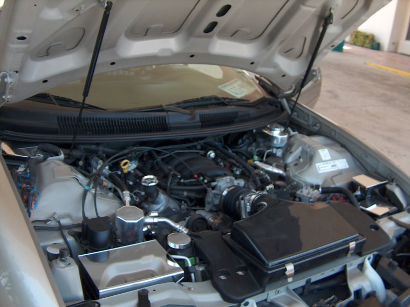 Engine with some goodies. The whisper lid is on it's way out when the SS hood goes on. The Volant system will take it's place with a BMR polished radiator shroud underneath the Volant box. A Chrome/polished Strut tower brace will be here shortly.